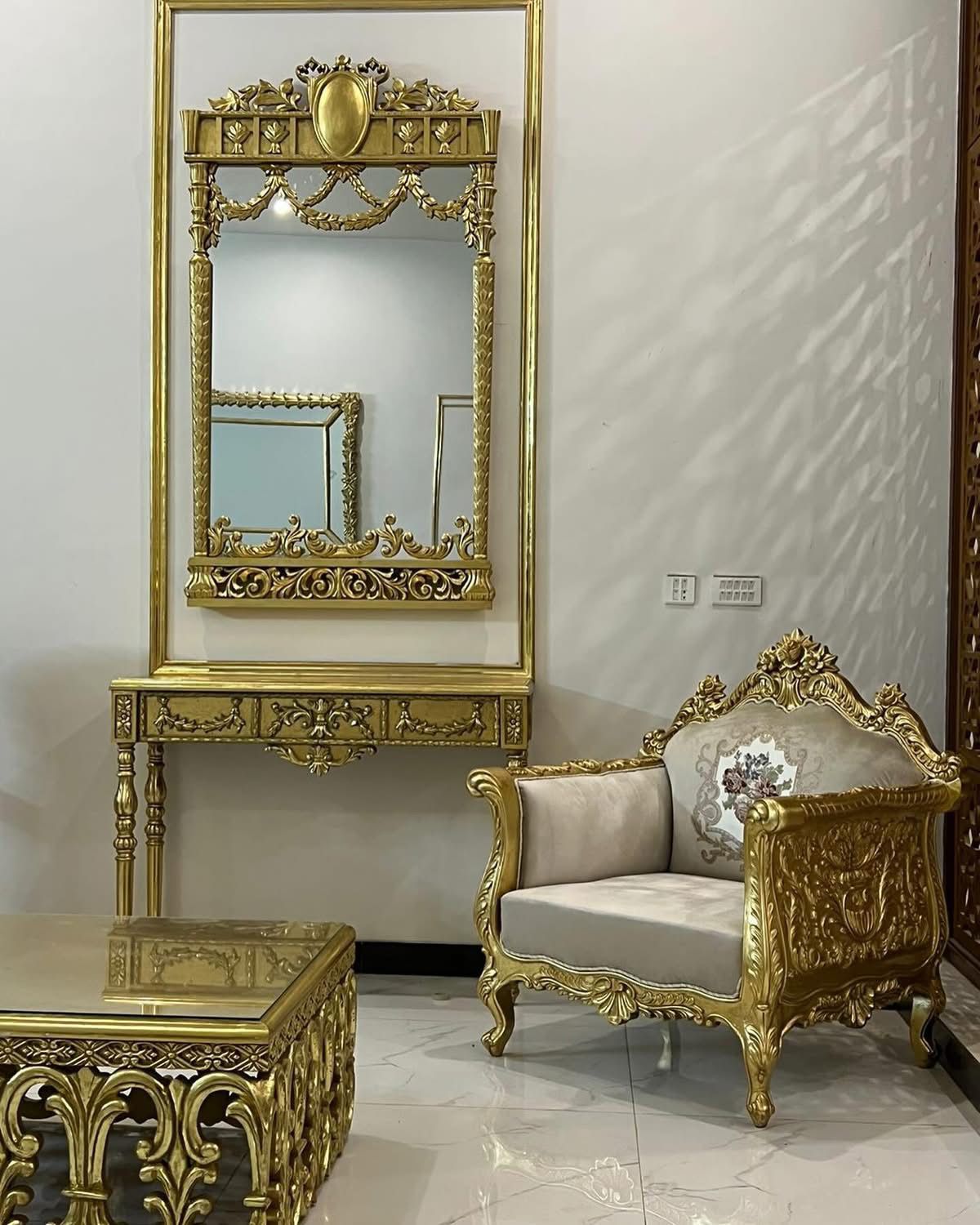 The royal armchair completes the set with soft fabric upholstery and intricate carvings. Every curve reflects skilled craftsmanship and luxury. Perfect for entryways, lounges, or bedrooms. Make your space stand out with Woodwing Furniture’s royal collection.