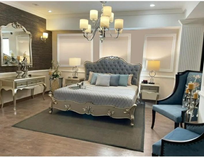 Upgrade your bedroom with this luxury tufted king bed, featuring a solid wood frame, hand-carved detailing, and a premium champagne finish. The high cushioned headboard adds comfort and elegance, making it ideal for master bedrooms, bridal rooms, and high-end interiors. Durable build, premium upholstery, and timeless design ensure lasting style and comfort.