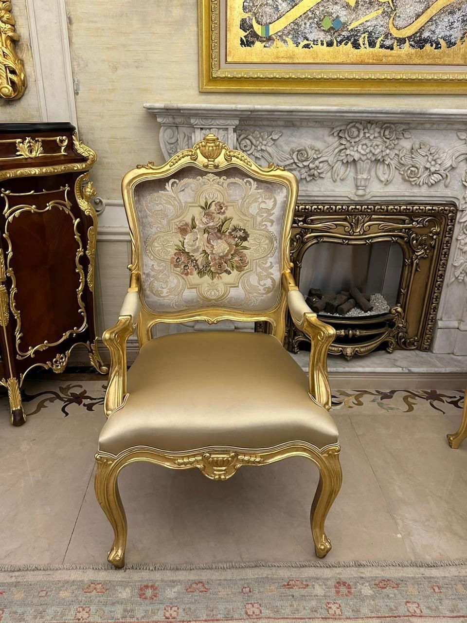 Elevate your home to a regal standard with our French-inspired Ornate Armchair. The frame is meticulously finished in antique gold leaf, showcasing detailed Rococo-style carvings on the crown, arms, and cabriole legs. The backrest features exquisite floral embroidery on cream silk, paired with a shimmering champagne satin seat for ultimate comfort. This high-end statement piece is perfect for those looking to create a classic, luxurious atmosphere in a formal foyer or dressing room.