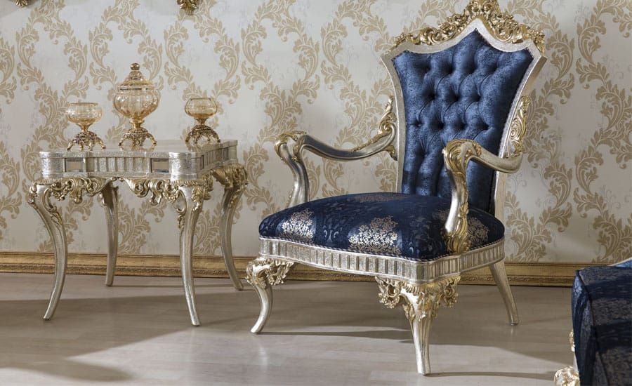 Command attention in any room with our Baroque-inspired Throne Chair. This exquisite piece features an intricately hand-carved silver frame with elegant cabriole legs and detailed floral accents. The high backrest is finished with premium royal blue velvet and classic button-tufting for a regal look, while the seat features a sophisticated patterned brocade for added texture and luxury. Whether placed in a formal living room, a luxury hotel lobby, or a grand foyer, this chair offers unmatched grandeur and artistic craftsmanship.