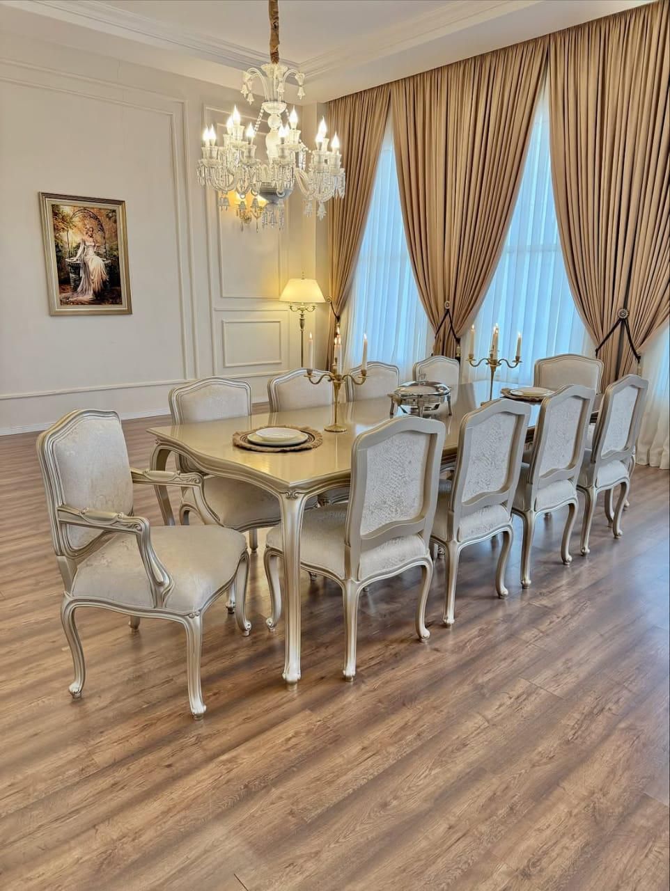 Each chair is expertly upholstered in a premium neutral fabric, offering both ergonomic support and timeless aesthetic appeal. The sweeping lines and regal silhouette of this set make it the perfect centerpiece for luxury estates, grand banquet halls, or high-end traditional homes.