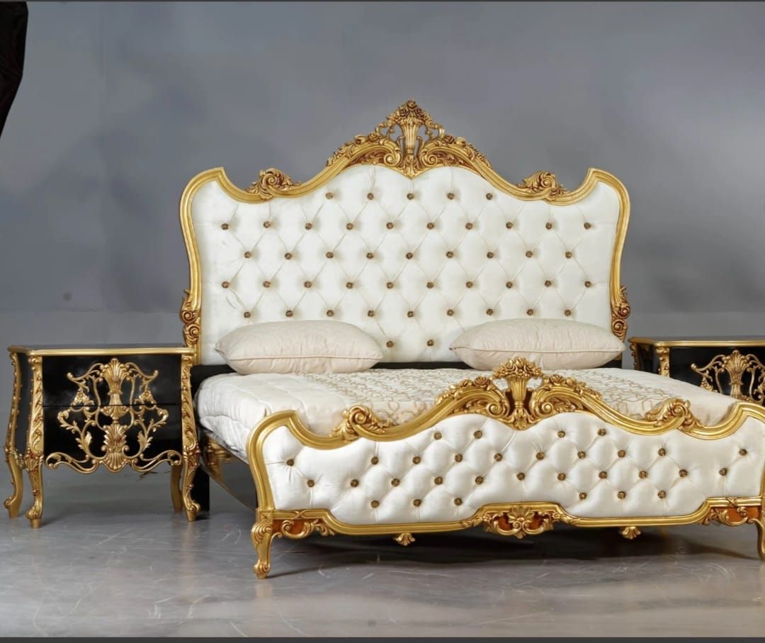 The commanding King Size Bed features a majestic, scrolled silhouette across both the headboard and footboard. Both are deeply padded and upholstered in pristine, high-quality Ivory or Cream Velvet, enhanced by exquisite diamond button tufting—a highly sought-after keyword in luxury bedding. The extensive wooden frame is hand-finished in an opulent 24k Gold Leaf (or high-quality Antique Gold finish), ensuring maximum visual impact and highlighting every intricate carving. The prominent hand-carved detailing along the crest and apron targets niche searches for authentic, high-craftsmanship furniture.