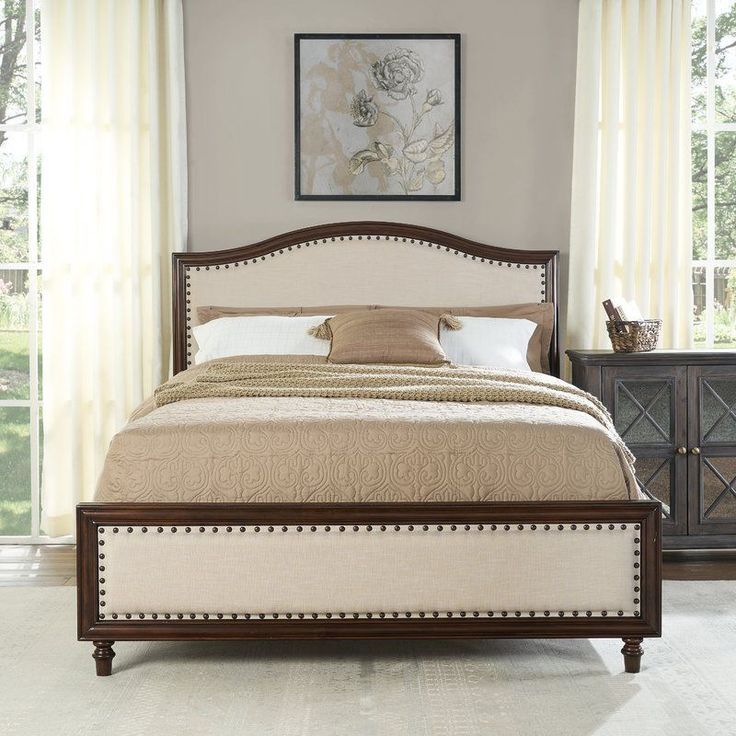 & Free ShippingElevate your bedroom with this Luxury Dark Wood Bed. It features a rich mahogany-finish frame and a soft cream fabric headboard. Detailed with silver nailhead trim, it combines classic royal style with modern comfort.